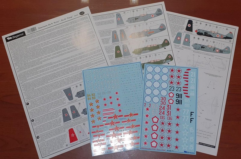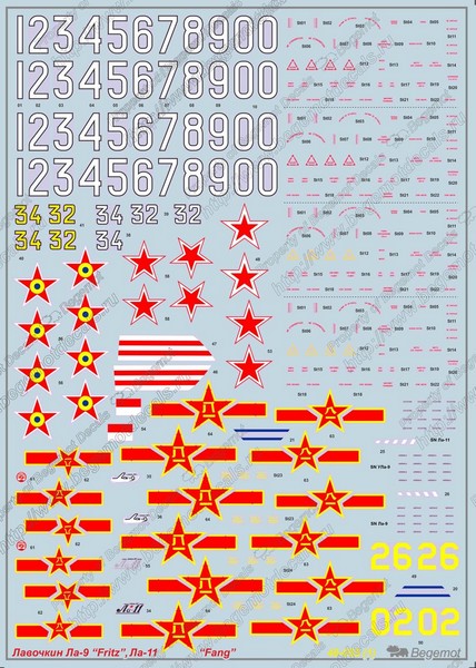 Декаль на 29 вариантов маркировки самолетов семейства Ла-9 и Ла-11: из состава ВВС СССР, Китая, Северной Кореи, Румынии и Индонезии. 4 набора технических надписей на самолеты Ла-9 и Ла-11 В комплект входит два листа деколи большого размера и инструкция на 5-и страницах формата А3.