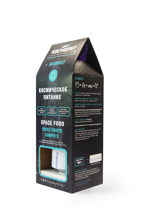Состав: Смесь компотная из сухофруктов, курага, сахар-песок, вода. Срок годности - 24 месяца Пищевая ценность на 100г. Белки - 0,1 г.; Жиры - 0,2 г.; Углеводы - 10,8 г. Энергетическая ценность на 100г. 45 ККал; 192 кДж. Масса Нетто - 165 гр. Состав набора: Туба с космическим питанием "Космопит", спиртовая салфетка, беспламенный подогреватель "КОСМОгрелка", вода деионизированная 30 мл, познавательный вкладыш. ВАЖНО: Вскрытую тубу хранить в прохладном месте, и употребить в течение 24 часов. Можно хранить без холодильника.