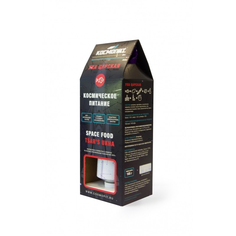Состав: Осетрина, картофель, лук репчатый, морковь столовая, масло подсолнечное, соль поваренная пищевая, перец чернй молотый, водка, питьевая вода. Срок годности: 24 месяца Пищевая ценность: Белки - 5,0г.; Жиры - 5,0г.; Углеводы - 6,6г.; 100 ККал; 420 кДж. Масса Нетто - 165 гр. Состав набора: Туба с космическим питанием "Космопит", спиртовая салфетка, беспламенный подогреватель "КОСМОгрелка"*, вода деионизированная 30 мл*,, познавательный вкладыш. ВАЖНО: Вскрытую тубу хранить в прохладном месте, и употребить в течение 24 часов. Можно хранить без холодильника. *Опционально в зависимости от варианта упаковки