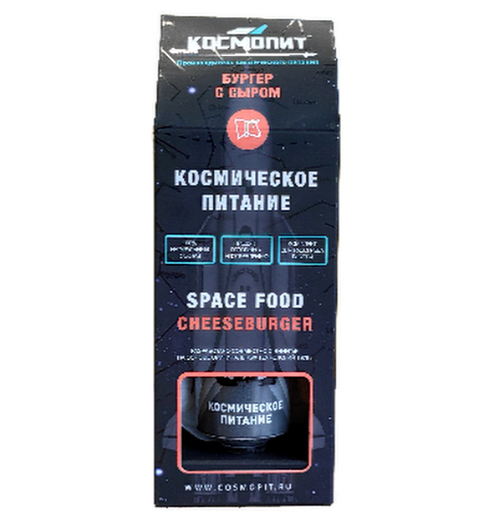 Состав: Мясо говядина, мука пшеничная высший сорт, сыр "Чеддер", солёные огурцы, лук, кетчуп, горчица столовая, масло подсолнечное, дрожжи хлебопекарные, сахар-песок, соль поваренная пищевая, вода питьевая. Срок годности: 24 месяца Пищевая ценность: Белки - 11,7г.; Жиры - 13,1г.; Углеводы - 27,58г.; 283 ККал; 1204 кДж. Масса Нетто - 165 гр. Состав набора: Туба с космическим питанием "Космопит", спиртовая салфетка, беспламенный подогреватель "КОСМОгрелка"*, вода деионизированная 30 мл*,, познавательный вкладыш. ВАЖНО: Вскрытую тубу хранить в прохладном месте, и употребить в течение 24 часов. Можно хранить без холодильника. *Опционально в зависимости от варианта упаковки