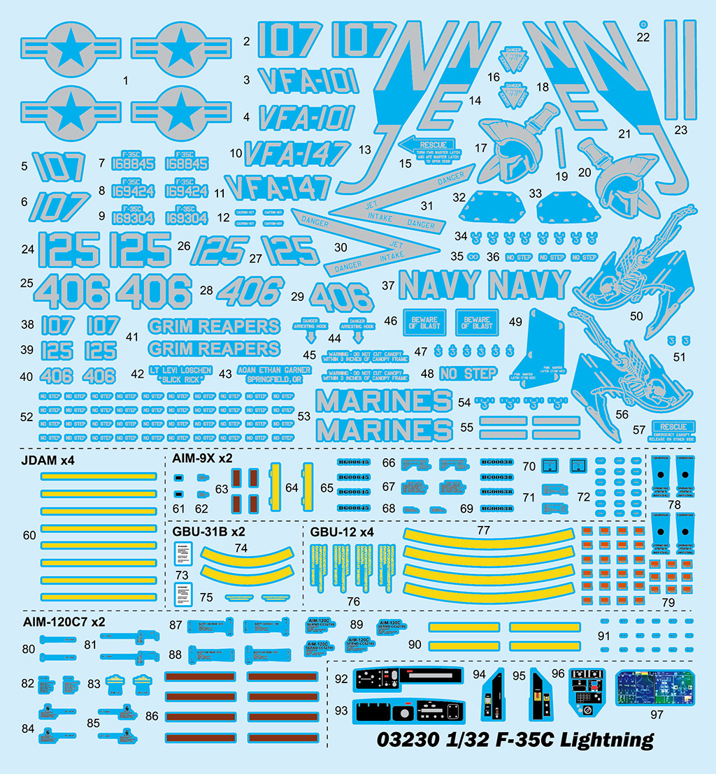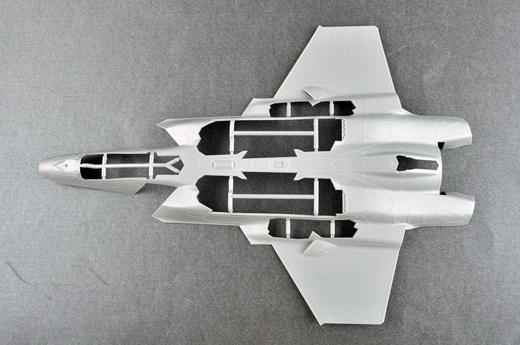 F-35 Lightning II (F-35 «Молния II») — семейство малозаметных многофункциональных истребителей-бомбардировщиков пятого поколения, разработанное американской фирмой Локхид-Мартин (Lockheed Martin) в трёх вариантах: F-35A наземный истребитель (CTOL — conventional takeoff and landing, «обычный» взлёт и посадка) для ВВС; F-35B истребитель с коротким взлётом и вертикальной посадкой (STOVL — Short take-off and vertical landing)[9]; F-35C палубный истребитель (CV) для ВМС. Краткое описание модели Длина: 495 мм Размах крыла: 413,7 мм Всего частей 380+ Рамки фототравления 1 шт Всего литников: 15 шт, нижняя часть фюзеляжа, верхняя часть фюзеляжа и шины