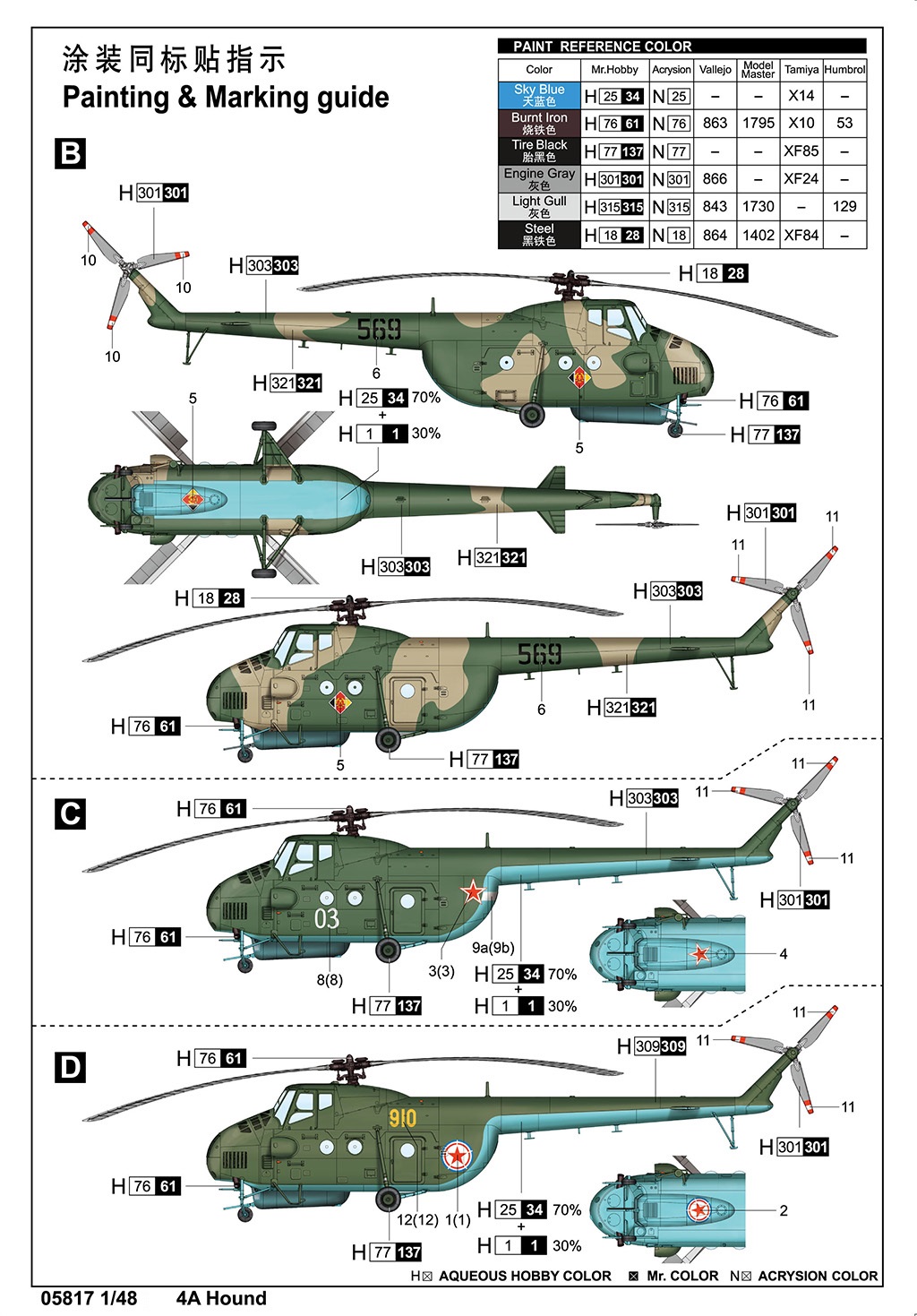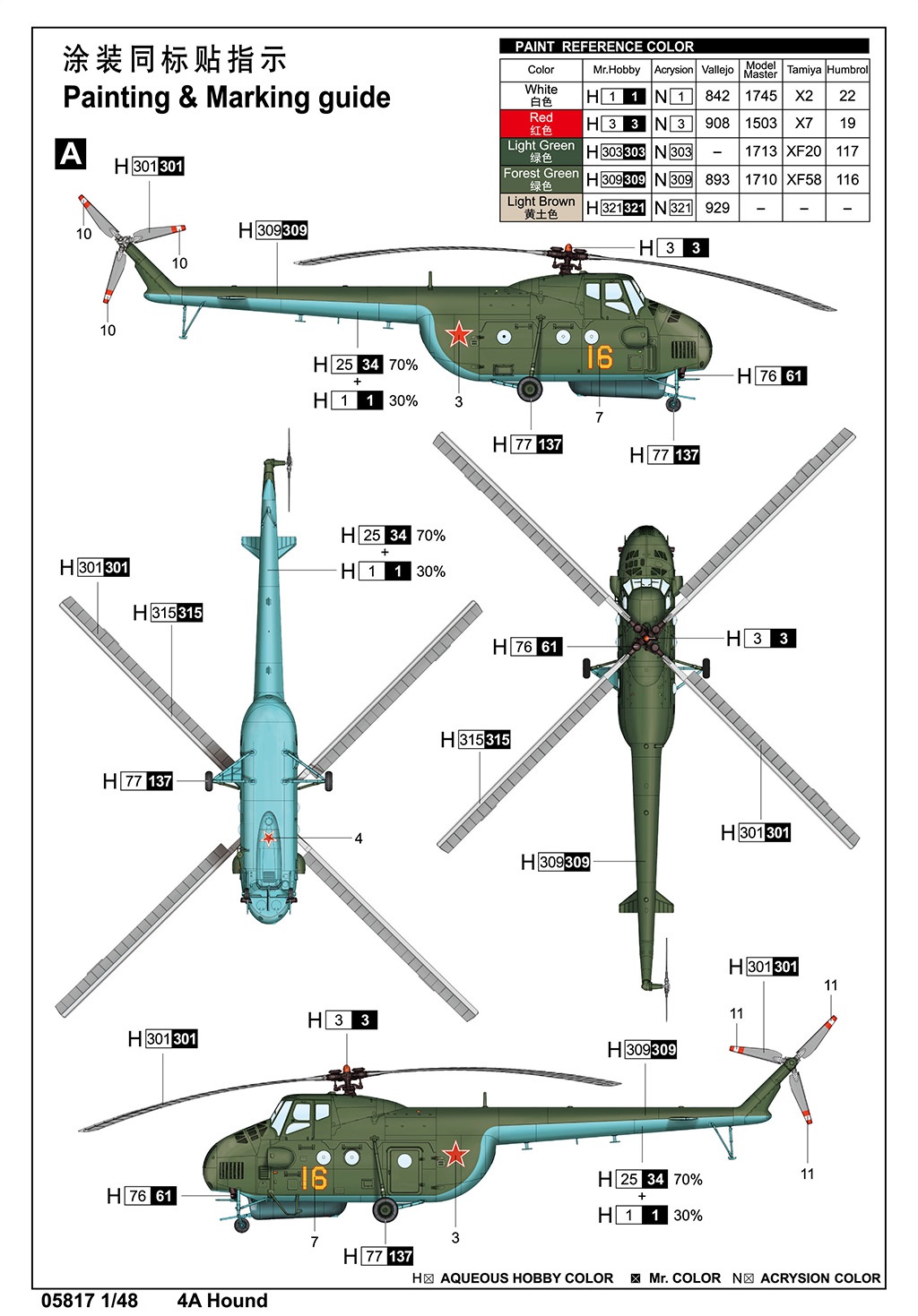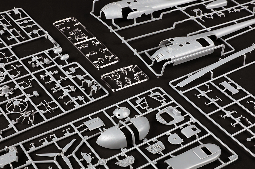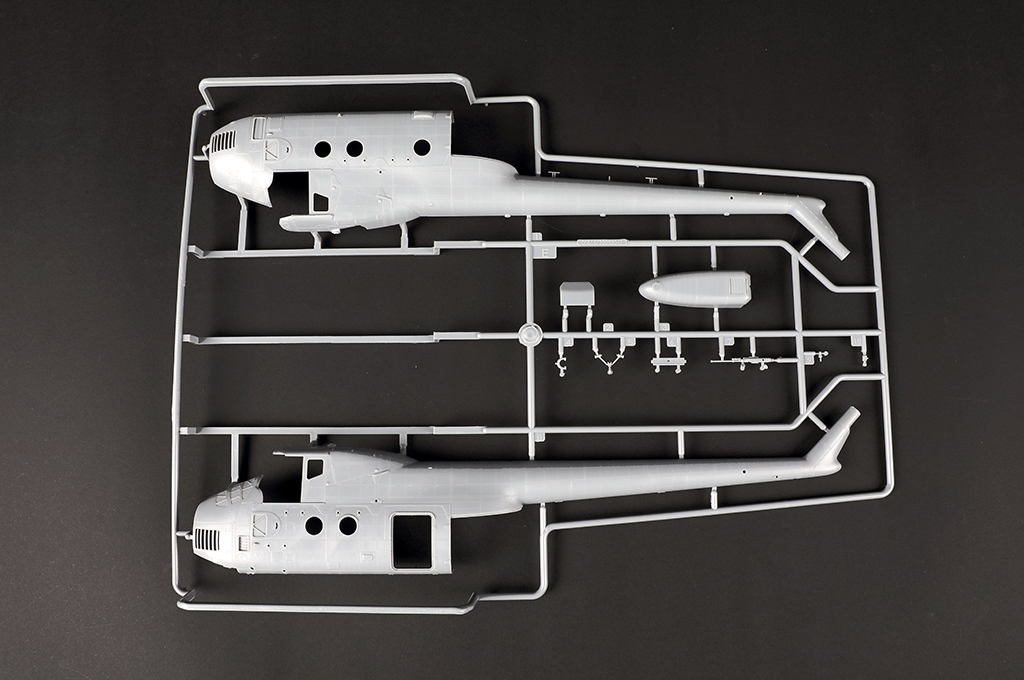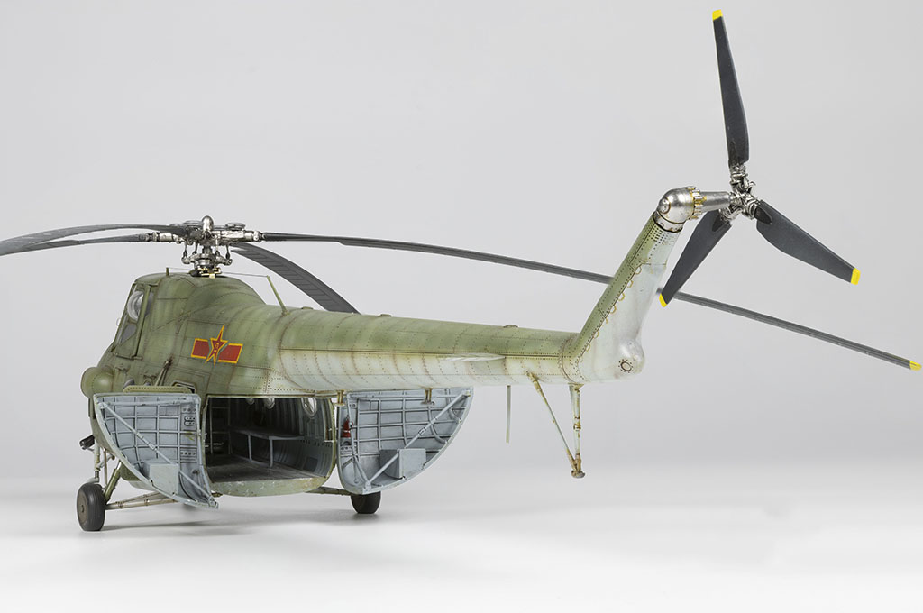 Ми-4 был разработан в ответ на американский H-19 Chickasaw и использование вертолетов США во время Корейской войны. Хотя Ми-4 внешне напоминает H-19 Chickasaw, это вертолет большего размера и способен поднимать больший вес. Первая модель поступила на вооружение в 1952 году и заменила Ми-1. Впервые вертолет был продемонстрирован внешнему миру в 1952 году на День советской авиации в Тушино. Длина: 340,6 мм Диаметр несущего винта: 430 мм Всего деталей 160+ Всего 7 литников