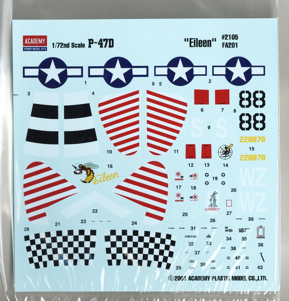 Republic P-47 Thunderbolt — американский одномоторный истребитель и истребитель-штурмовик, построенный по схеме низкорасположенного крыла с классическим хвостовым оперением. Считается одним из лучших американских истребителей Второй мировой войны. Полет прототипа состоялся в 1941 г., а серийное производство продолжалось в 1942-1945 гг. P-47 можно назвать рабочей лошадкой ВВС США как в Европе, так и на Тихом океане. Хотя двигатель R-2800 Double Wasp мощностью 2000 л.с., турбина и выхлопная система сделали самолет очень большим и тяжелым, это не стало препятствием для достижения высоких характеристик. Полезность машины была настолько велика, что ее использовали как для сопровождения бомбардировщиков, так и для бомбовых вылетов с Р-47 в ведущей роли. О классе P-47 свидетельствует огромное количество выпущенных самолетов. Их было 15660, а в спецификации D целых 12602, что является абсолютным рекордом по количеству выпущенных истребителей в одной модификации. Другой распространенной версией был P-47N с измененным крылом, топливными баками большего размера и более мощным двигателем. Он использовался и как истребитель, и как штурмовая машина. Даже после Второй мировой войны «Тандерболт» оставался одним из самых популярных американских истребителей до начала 1950-х годов. Технические данные (версия Р-47Д): длина: 11м, размах крыла: 12,42м, высота: 4,47м, максимальная скорость: 697км/ч, скороподъемность: 15,9м/с, максимальная дальность: 2900км, практический потолок: 13100м, Вооружение: стационарное — 8 12,7-мм пулеметов М2, подвесное — до 1100 кг бомб или неуправляемых ракет.