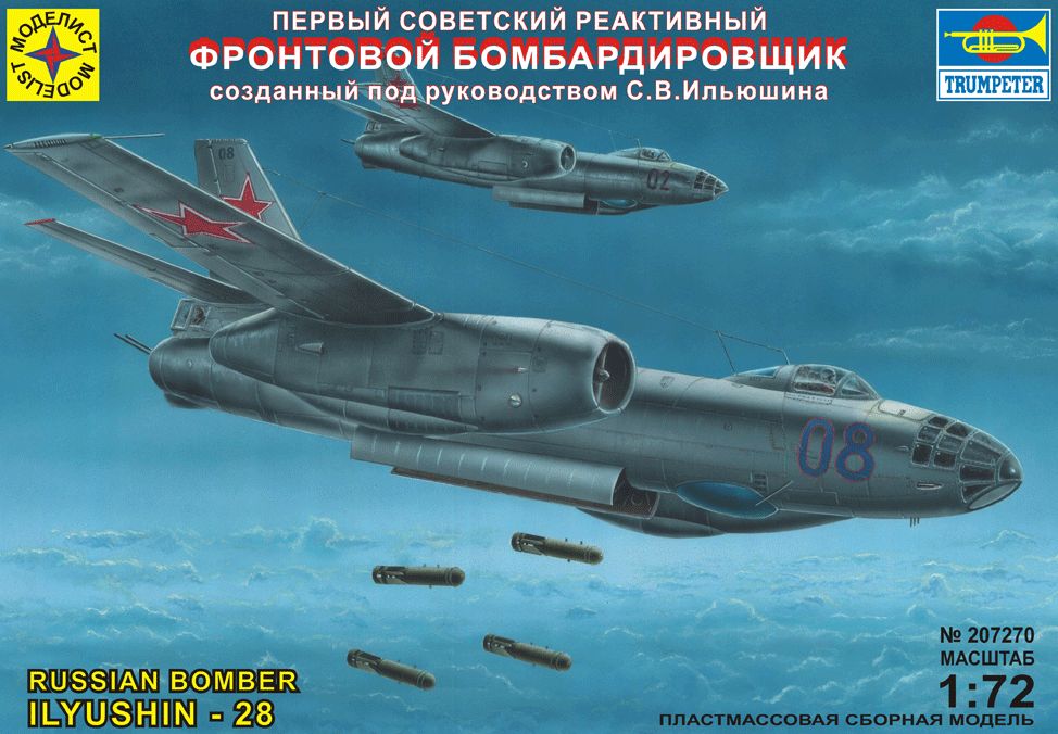 Первый советский реактивный фронтовой бомбардировщик созданный под руководством С.В.Ильюшина. СССР, 1948 г. Фронтовой бомбардировщик, предназначен для нанесения бомбовых ударов в прифронтовых тылах противника. Идея такого самолета возникла после окончания Великой Отечественной войны, когда повсюду началось переоснащение сначала военной, а потом и гражданской авиации реактивными самолетами взамен поршневых, что обеспечивало резкий скачок в летных качествах. Работу над его созданием С.В.Ильюшин начал в инициативном порядке. Результатом ее был самолет, превзошедший Т-14 и потому занявший место фронтового бомбардировщика. Первый полет бомбардировщик ОКБ Ильюшина совершил 8 июля 1948 г (летчик-испытатель В.К. Коккинаки). Серийное производство самолета было развернуто сразу на трех заводах: в Москве, в Воронеже и в Омске. Всего за период серийного производства было выпущено 6316 самолетов всех модификаций. Для обеспечения возможности действовать в любых метеоусловиях самолёт оборудовался эффективной антиобледенительной системой (это оказался единственный самолёт, который промозглым днём 9 марта 1953 года в условиях низкой облачности со снегом и дождём мог лететь над Красной площадью, отдавая последние почести Сталину). В первую очередь новыми самолётами оснащались полки фронтовой авиации западных округов. С лета 1951 года эти фронтовые бомбардировщики стали поступать в авиацию ВМФ. 42 самолёта в 60-е годы базировалось на Кубе и вполне могли нанести удар по территории США в период Карибского кризиса. Первое боевое применение относится к 1956 году (подавление вооружённого мятежа в Венгрии). Получивший широкое признание самолет экспортировался в 24 страны и принимал участие во многих конфликтах, начиная с войны в Корее. После разрыва сотрудничества с СССР, в Китае на заводе в г. Харбин было организовано ремонтное производство, а с 1964 года серийное производство и выпуск самолетов этого типа под обозначением Н-5. В Чехословакии бомбардировщик ОКБ Ильюшина выпускался по лицензии компанией «Авиа» под обозначением В-228. Летные качества этого самолета долгое время оставались на высоте требований к данному классу, а самолеты, казалось бы, более прогрессивные, например, со стреловидным крылом, не могли показать перед ним существенных преимуществ. В СССР выпуск самолета был прекращен в 1956 г., но, благодаря своим высоким характеристикам, он находился на вооружении до середины 80-х годов.