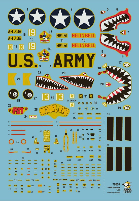 В набор входят: пластиковые молдинги носовая часть фюзеляжа, напечатанная на 3D-принтере из смолы маски для покраски кабины и колес декаль с тремя вариантами маркировки (США) стальные шарики для загрузки носовой части Варианты покраски и маркировки