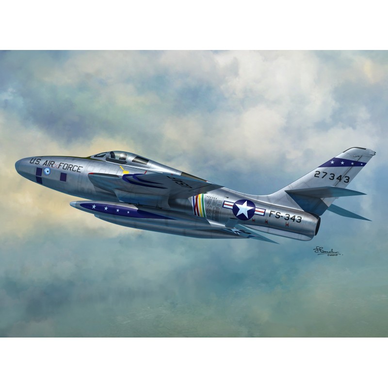 Republic F-84 Thunderjet — американский одноместный одномоторный истребитель-бомбардировщик. Это был один из первых реактивных истребителей на вооружении ВВС США. Полет прототипа состоялся в феврале 1946 г., а к 1953 г. было построено 4450 экземпляров этого самолета. Первоначально предполагалось, что он будет называться P-84, но со временем его изменили на F-84. Вариант F-84E имел фюзеляж в кабине пилота на 12 дюймов длиннее, чтобы сделать полет более комфортным. Емкость топливного бака также увеличилась. Подкрыльевые узлы также были переработаны, чтобы вместо бомб можно было нести дополнительные топливные баки. Глубокие изменения коснулись версии F-84F Thunderstreak, которая получила косые крылья, новый двигатель и служила в первую очередь штурмовиком. Модель «G» также претерпела более глубокие изменения. В первую очередь он получил новый двигатель Allison J35-A-29 с тягой около 2650 кг, что увеличило его максимальную скорость до 1000 км/ч и запас хода 1600 км. F-84G также был первым истребителем, способным нести ядерное оружие. Самолеты F-84 широко использовались во время Корейской войны. В первый период конфликта они выполняли функции истребителей, но в результате катастрофического баланса воздушных боев с МиГ-15 (8 побед против 64 потерянных самолетов) быстро перешли на роль разведчиков и штурмовиков. Технические данные (версия F-84G): Максимальная скорость: 1000 км/ч, скорость набора высоты: 19,1 м/с, максимальный потолок 12 350 м, максимальная дальность: 1600 км, вооружение: стационарное — 6 пулеметов M2 Browning 12, 7мм , подвеска - до 2020кг бомб и ракет, в том числе ядерная бомба Mark VII.