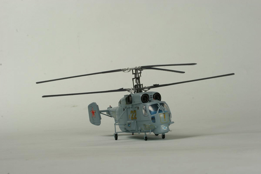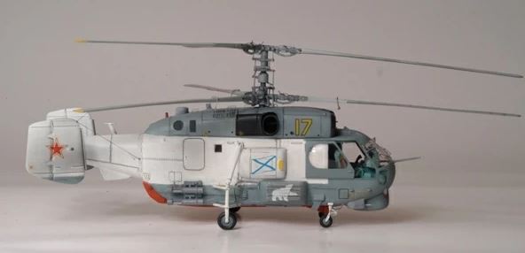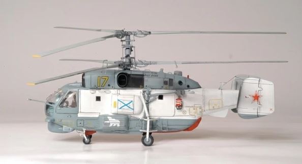 Сборная модель - Российский противолодочный вертолет "Морской охотник". Историческая справка: Советский противолодочный вертолет был создан в КБ им. Камова в конце 70-х годов по заказу ВМФ СССР. Предназначен для поиска и уничтожения подводных лодок и ведения разведки. Приспособлен для посадки и взлета с кораблей ВМФ. Набор деталей из пластмассы для сборки одной модели вертолета.