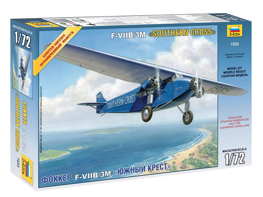 Самолет А. Фоккера, созданный в 1925 году был первым пассажирским самолетом с тремя двигателями. Наибольшую известность приобрел вариант самолета «Южный крест», на котором в 1928 году был совершен сверхдальний перелет через Тихий океан из Сан-Франциско (США) до Брисбейна в Австралии. Поверхность модели требует доработки, поэтому модель рекомендована только для опытных моделистов. Комплект пластиковых деталей для сборки 1 модели. Длина модели 20 см. Остекление выполнено деталями из прозрачного пластика. 2 сидящие и 2 стоящие фигуры пилотов. 58 деталей. Клей в комплект не входит. Краски в комплект не входят.