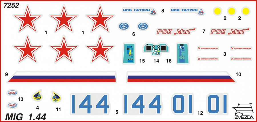 Сборная модель - Российский многофункциональный истребитель нового поколения МиГ 1.44 МФИ. Историческая справка: Первые работы по созданию многофункционального истребителя (МФИ) пятого поколения начались еще в конце 70-х годов. Самолет создавался по формуле "три С": сверхзвуковая крейсерская скорость; сверхманевренность; скрытность. В январе 1999 года публично был показан летный образец. Первый испытательный полет самолет совершил 29 февраля 2000 года.