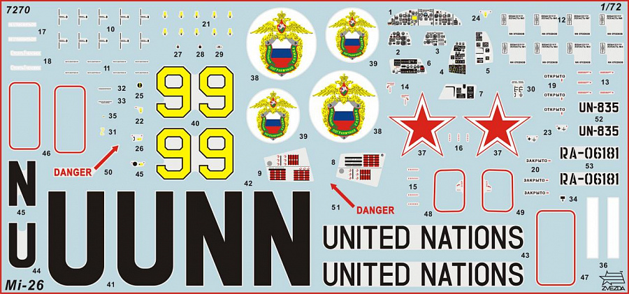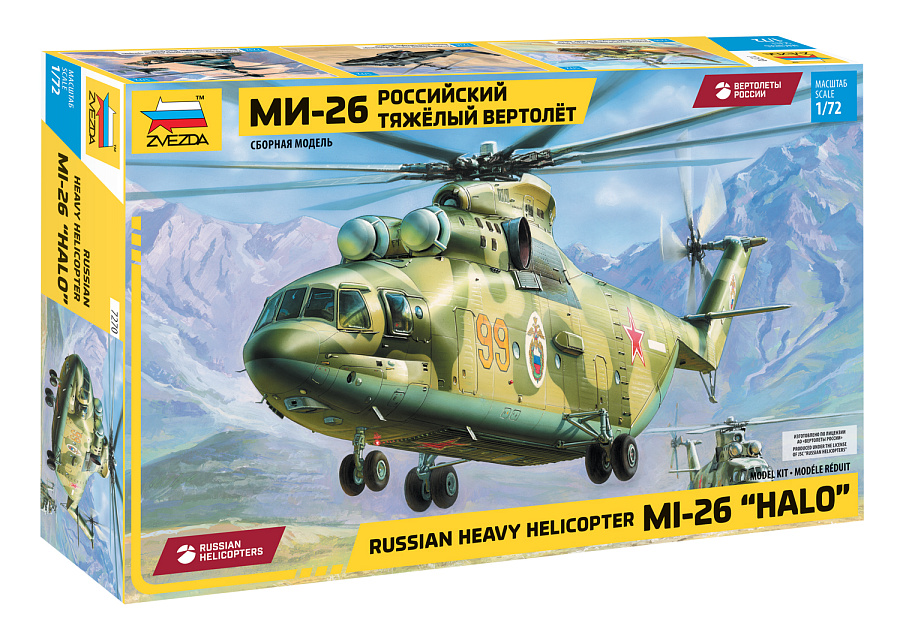 Сборная модель - Российский тяжелый вертолет Ми-26. Историческая справка: Вертолет Ми-26 является самым тяжелым летающим вертолетом в мире. Ми-26 был разработан в семидесятых годах, а поступил на вооружение в 1981. Это уникальный транспортный вертолет для быстрой переброски войск. Он успешно применялся в первой и второй Чеченской войне. Всего за время серийного производства было выпущено 276 вертолетов. Ми-26 стоит на вооружении ВВС стран СНГ, Индии, Малайзии, Перу, Южной Кореи и используется в гражданских целях. Набор деталей из пластмассы для сборки одной модели вертолета.