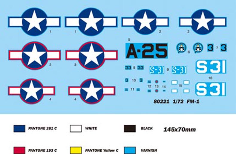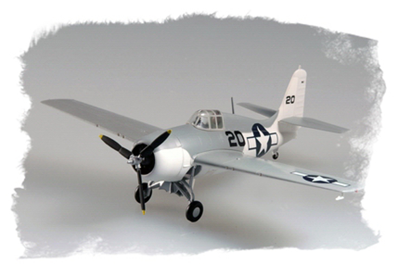 Грумман F4F «Уайлдкэт» (англ. Grumman F4F Wildcat) — американский одноместный палубный истребитель-бомбардировщик. Изначально проектировался как биплан, но в серию пошёл как свободнонесущий среднеплан (сказались требования к скоростным характеристикам). Прототип совершил первый полёт 2 сентября 1937 года. FM-1 В начале 1942 года фирма «Грумман» начала выпуск истребителя F6F-3 «Хеллкэт». Флот присвоил программе выпуска высочайший приоритет. Для освобождения мощностей завода в Бетпейдж были проведены трёхсторонние переговоры с участием представителей флота, «Грумман» и «Дженерал Моторс». Фирма «Дженерал Моторс» владела на восточном побережье пятью автомобильными заводами, простаивавшими из-за прекращения производства легковых автомобилей в связи с войной. Согласно достигнутому соглашению, «Дженерал Моторс» организовало «Истерн Эйркрафт Дивижн» — подразделение для выпуска самолётов. Фирма «Грумман» занялась обучением и подготовкой персонала «Дженерал Моторс». В начале 1942 года завод в Трентоне, штат Нью Джерси, приступил к лицензированному «Грумман» производству торпедоносцев TBF «Эвенджер», получивших обозначение TBM. Завод в Линдене, штат Нью Джерси, занялся производством F4F, получившего обозначение FM-1. Три других завода производили комплектующие. 18 апреля 1942 года «Истерн Эйкрафт Дивижн» получил контракт на производство 1800 «уайлдкэтов». Первые 10 самолётов были собраны из машинокомплектов, прибывших из Бетпейджа, и ничем не отличались от F4F-4 последних серий. В следующие экземпляры был внесён ряд изменений. Согласно замечаниям, полученным от пилотов, сняли по одному пулемёту с каждой консоли, вернувшись к вооружению из четырёх 12,7-мм пулемётов с боекомплектом по 430 патронов на ствол. Как и на ранних F4F-4, существовала возможность подвески под нескладываемой частью крыла двух сбрасываемых подкрыльевых баков объёмом по 220 литров Часть FM-1 была поставлена по ленд-лизу в Британию. Эти самолёты получили британское обозначение Martlet V, в январе 1944 года изменённое на Wildcat V. Всего до сентября 1943 года успели произвести 839 FM-1 для флота и 311 Martlet V. Затем завод перешёл на выпуск FM-2. Выпуск осуществлялся двумя партиями — BuNo 14992-15951 и 46738-46837. Поставляемые в Британию самолёты сначала получали номер бюро Аэронавтики, который потом менялся на британский серийный номер. Martlet V получили номера с JV325 по JV636. Длина: 122 мм Размах крыльев: 161 мм Высота: 54 мм Всего пластиковых деталей 19 штук Всего литников 4 шт.