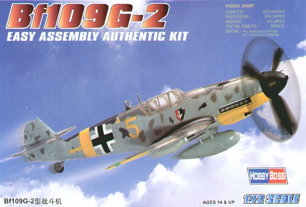 Мессершмитт Bf 109 (нем. Messerschmitt Bf 109, традиционное для СССР написание — Ме-109) — одномоторный поршневой истребитель-низкоплан, состоявший на вооружении Люфтваффе и ВВС различных стран почти 30 лет. В зависимости от модификации использовался в качестве дневного истребителя (включая специализированные модификации для малых высот и семейство версий высотных истребителей), дневного и ночного истребителя-перехватчика, истребителя-штурмовика, истребителя-бомбардировщика, истребителя-фоторазведчика и фоторазведчика без вооружения (в том числе и высотного), а также учебно-тренировочного истребителя. Являлся одним из двух основных истребителей «Люфтваффе», самым массовым самолётом Германии на протяжении всей Второй мировой войны, а также самым массовым истребителем в истории. Messerschmitt Bf 109G (Gustav, «Густав»), ставшая самой массовой моделью Bf 109, имела новый двигатель Daimler-Benz DB 605. Это был, по сути, двигатель DB 601 с блоком цилиндров, переработанным таким образом, что общий объём цилиндров возрос с 33,9 до 35,7 литра, что дало увеличение мощности на 175 лошадиных сил без заметного увеличения размеров. Новые самолёты стали поступать в войска в мае 1942 года. Размеры модели Длина: 125 мм Размах крыльев: 137 мм Высота: 45 мм Всего пластиковых деталей 31 шт Всего литников 4 шт