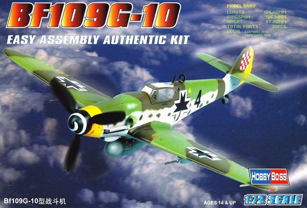 Мессершмитт Bf 109 (нем. Messerschmitt Bf 109, традиционное для СССР написание — Ме-109) — одномоторный поршневой истребитель-низкоплан, состоявший на вооружении Люфтваффе и ВВС различных стран почти 30 лет. В зависимости от модификации использовался в качестве дневного истребителя (включая специализированные модификации для малых высот и семейство версий высотных истребителей), дневного и ночного истребителя-перехватчика, истребителя-штурмовика, истребителя-бомбардировщика, истребителя-фоторазведчика и фоторазведчика без вооружения (в том числе и высотного), а также учебно-тренировочного истребителя. Являлся одним из двух[ основных истребителей «Люфтваффе», самым массовым самолётом Германии на протяжении всей Второй мировой войны, а также самым массовым истребителем в истории. Bf 109G-10 Модификация Bf 109G-10 упоминается как «самолёт-бастард завода Erla» в книге «Варианты самолётов Люфтваффе». Bf 109G-10 собирался на основе планёра Bf 109G с внесением незначительных изменений. Вопреки расхожему мнению, это была полноценная серия самолётов, сошедших с конвейера, а не переделки предыдущих модификаций. Машина оснащалась новым двигателем DB 605 D-2, созданным для поддержания темпов производства при минимальных изменениях на сборочных линиях. Это была вынужденная мера в связи с задержкой поточного производства Bf 109K. Примечательным является то, что Bf 109G-10 пошёл в серию позже Bf 109G-14, хотя нумерация моделей предполагает обратное. Bf 109G-10 оказался самым скоростным истребителем серии G. При стандартной полётной массе 3100 кг он развивал скорость у земли 550 км/ч и 690 км/ч на высоте 7400 м. В отличие от базовой модели на субмодификации G-10/U4 устанавливалась мотор-пушка МК-108. Вновь пошли в дело полевые доработанные комплекты: Bf 109G-10/R1 получил подфюзеляжный держатель ЕТС-500 для одной 250-кг бомбы или четырёх 50-кг бомб на переходной балке ER-4, переключатель выбора варианта вооружения, а также 5-мм бронеплиту под маслобаком. Bf 109G-10/R2 с двигателем DB 605DB был разведчиком без пулемётов MG 131 с фотоаппаратом Rb 50/30 или Rb 75/30. Bf 109G-10/R4 дополнительно вооружался парой 30-мм пушек МК 108 в подкрыльевых гондолах. Bf 109G-10/R6 отличался от последнего применением 20-мм пушек MG 151 вместо МК-108. На машинах субмодификации Bf 109G-10/R7 под крылом могли подвешиваться две пусковые установки Wfr.Gr.21 для 210-мм неуправляемых реактивных снарядов, а комплект R8 означал возможность установки фотокинопулемёта BSK 16 в левой консоли. С октября 1944 года до конца войны было выпущено около 2600 G-10 Длина: 126 мм Размах крыльев: 136 мм Высота: 47 мм Всего пластиковых деталей 31 шт. Всего литников 4 шт.