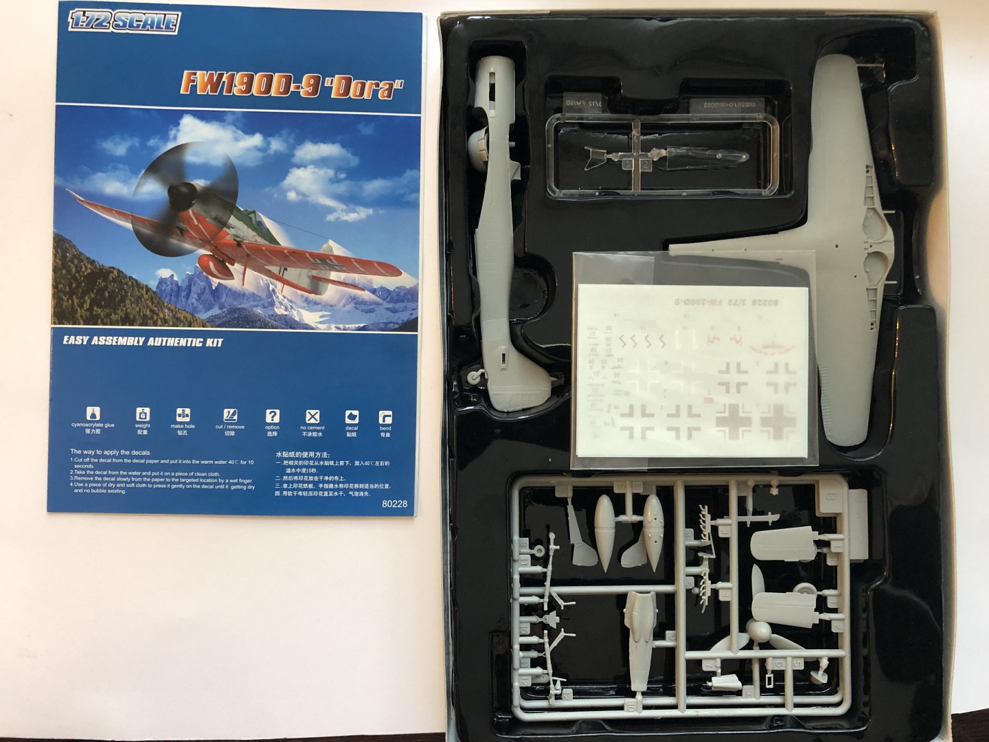 Фокке-Вульф Fw.190 (нем. Focke-Wulf Fw.190 «Würger» - сорокопут, мелкая хищная птица) — немецкий одноместный одномоторный поршневой истребитель-моноплан, стоявший на вооружении люфтваффе во время Второй мировой войны. Fw.190 успешно использовался в различных амплуа, в частности в роли высотного перехватчика (в особенности Fw.190D), эскортного истребителя, штурмовика, ночного истребителя и зарекомендовал себя настоящей «рабочей лошадкой» люфтваффе. Внутри компании «Фокке-Вульф» типам самолётов в качестве дополнительного описания давали имена птиц. Fw.190 получил имя нем. «Würger» — «Сорокопут» (небольшая хищная птица). FW-190 D-9 В конце 1943 года в связи с введением новой системы стандартизации, которая затрагивала всё производство FW-190, было принято решение остановить доводку запланированных версий D-1 и D-2. Вместо них, в качестве варианта дальнейшего развития самолёта и первой серийной версии высотного истребителя был предложен FW-190D-9. Своё обозначение «9» он получил из-за того, что основой фюзеляжа этой машины стал фюзеляж FW-190A-9. Варианты D-3 — D-8 никогда не проектировались и не строились. Большинство машин серии D-9 ранних выпусков вооружали двумя 13-мм пулемётами MG 131, установленными в фюзеляже над двигателем, и двумя 20-мм пушками MG 151/20 в корне крыла. Размеры модели Длина: 141 мм Размах крыльев: 145 мм Высота: 53 мм Всего пластиковых деталей 26 шт. Всего литников 4 шт.