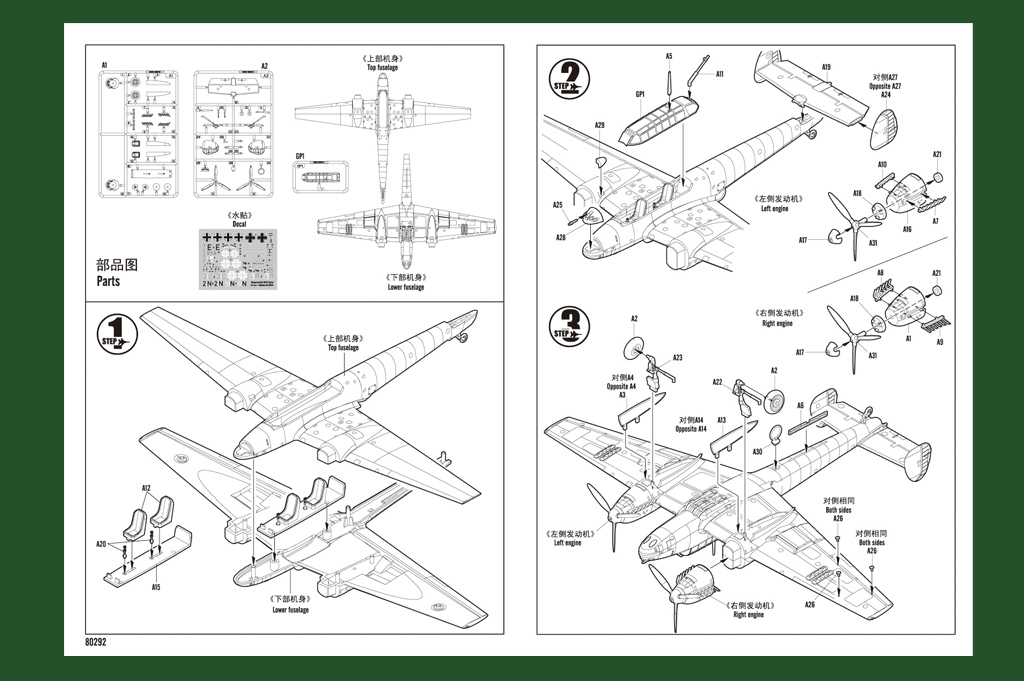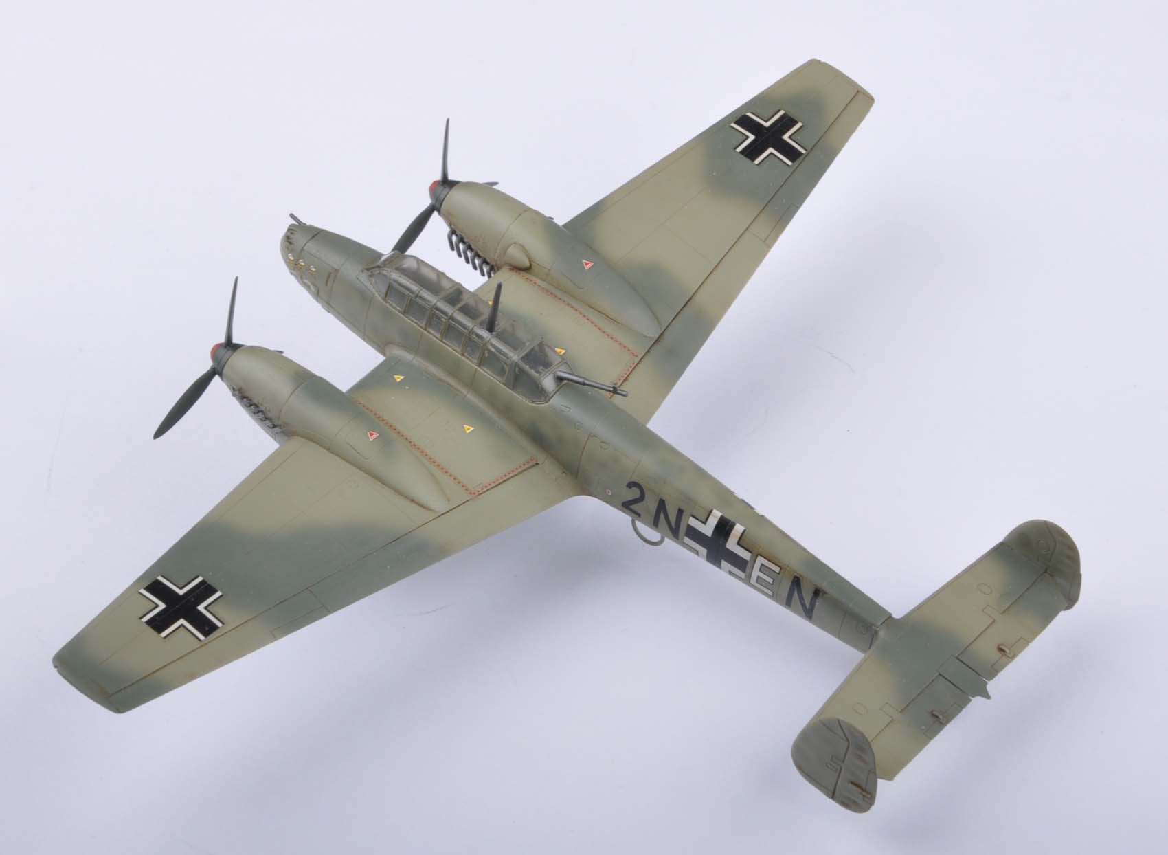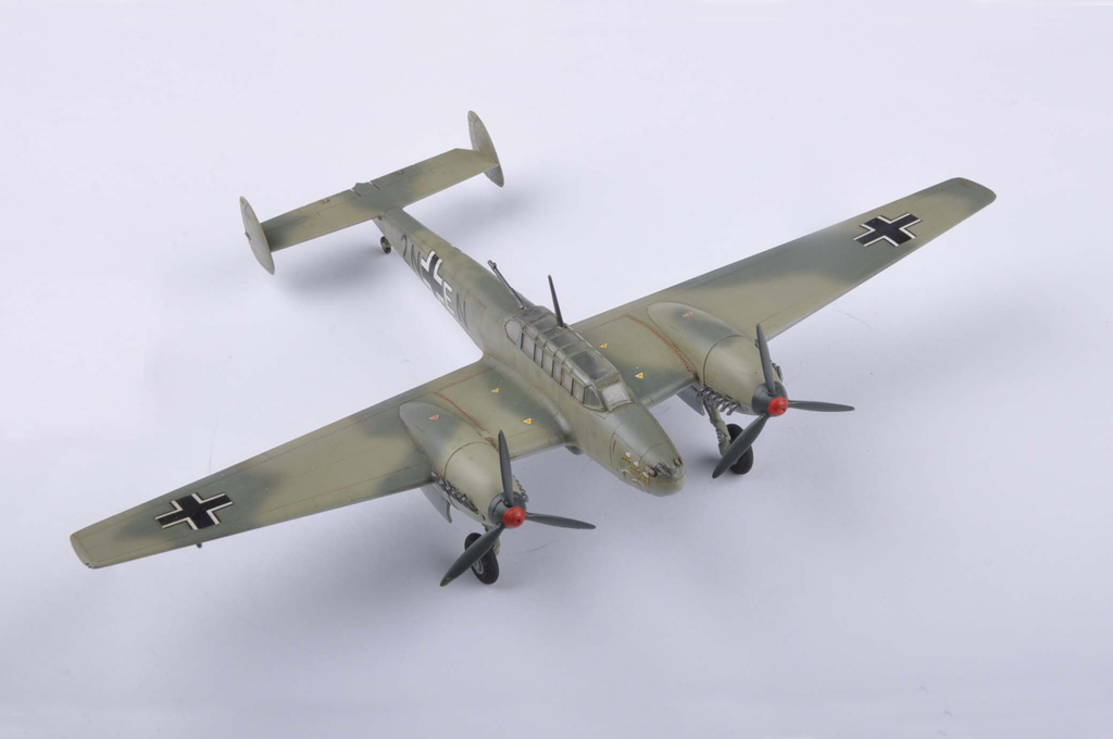 Мессершмитт Bf.110 — двухмоторный тяжёлый истребитель многоцелевого назначения на службе Люфтваффе во время Второй мировой войны, в дальнейшем был переквалифицирован в истребитель-бомбардировщик и ночной истребитель-перехватчик. Размеры модели Длина: 169,8 мм Размах крыльев: 225,6 мм Всего пластиковых деталей более 40 Всего литников - 3, верх и низ фюзеляжа
