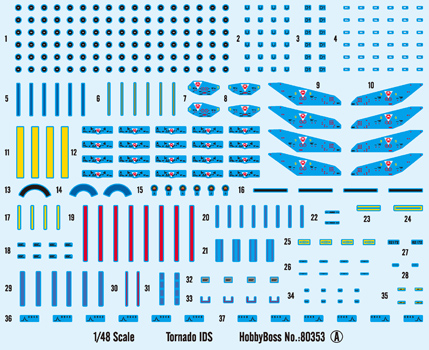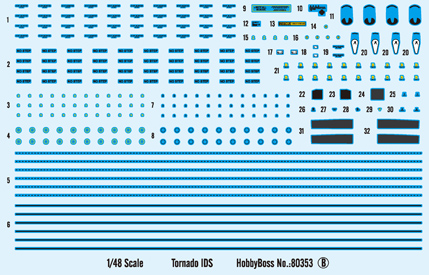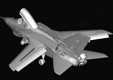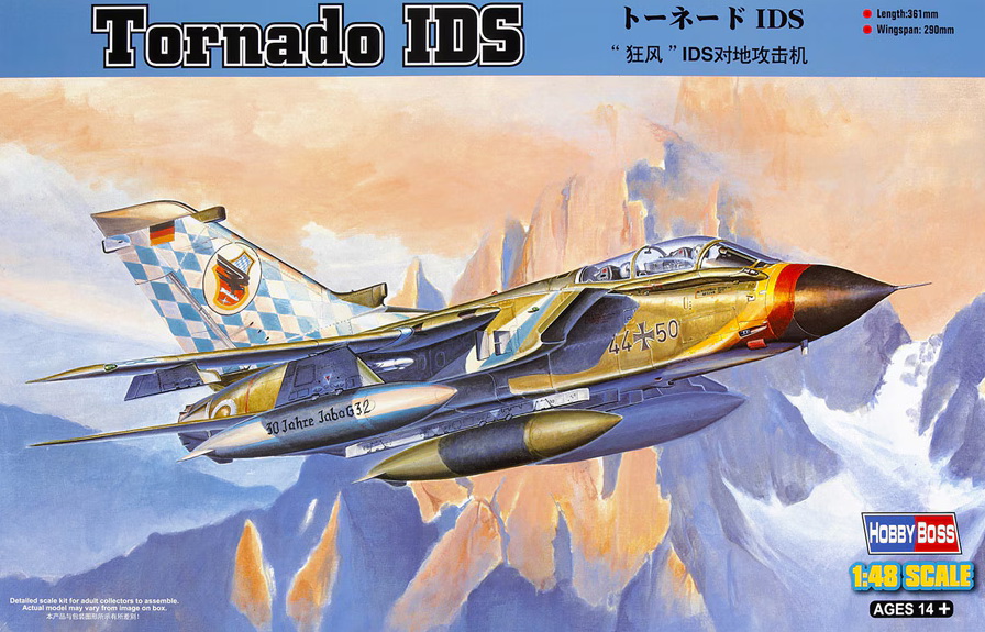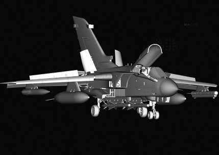Tornado — европейский боевой сверхзвуковой реактивный самолёт третьего поколения с крылом изменяемой стреловидности. Также именовался как MRA-75 и Panavia 200. Tornado IDS — истребитель-бомбардировщик ВВС и ВМС Германии, а также ВВС Италии Длина: 361 мм Размах крыльев: 290 мм Всего пластиковых деталей 416 шт. Всего литников 20, Верхняя и нижняя части фюзеляжа