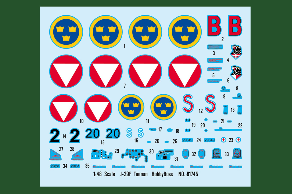 Сааб 29 «Туннан» (швед. Saab 29 Tunnan, flygande tunnan — летающая бочка) — второй шведский реактивный истребитель (первый — Saab 21R). Разработан компанией Saab AB. Совершил первый полёт 1 сентября 1948 года. Серийно производился в 1950—1956 годах (построена 661 машина). Состоял на вооружении ВВС Швеции с 1950 года, эксплуатация истребительных модификаций завершена в 1965 году, других — несколько позже. «Туннан» использовался во время миротворческой операции ООН в Конго в начале 1960-х годов и остаётся единственным шведским реактивным самолётом, участвовавшим в боевых действиях. Поставлялся на экспорт в Австрию. Использовался в шпионских полетах над территорией СССР в конце 50-х годов. Длина: 195,5 мм Размах крыльев: 214,4 мм Всего пластиковых деталей более 120 Всего литников 5