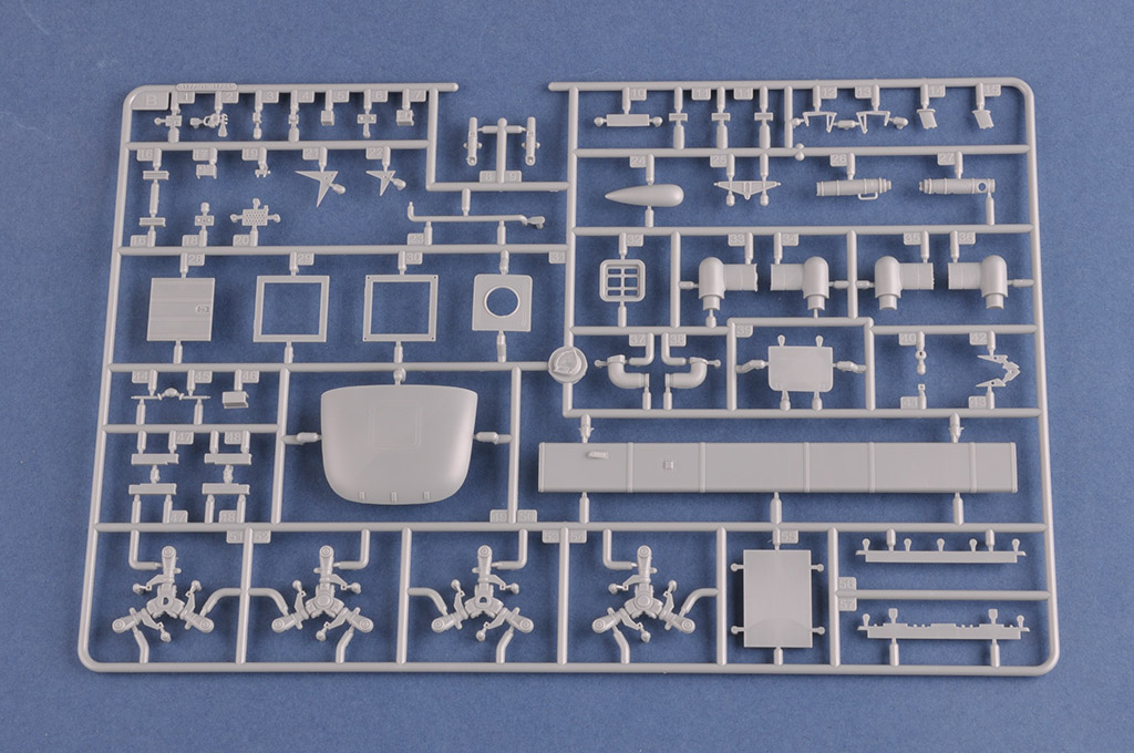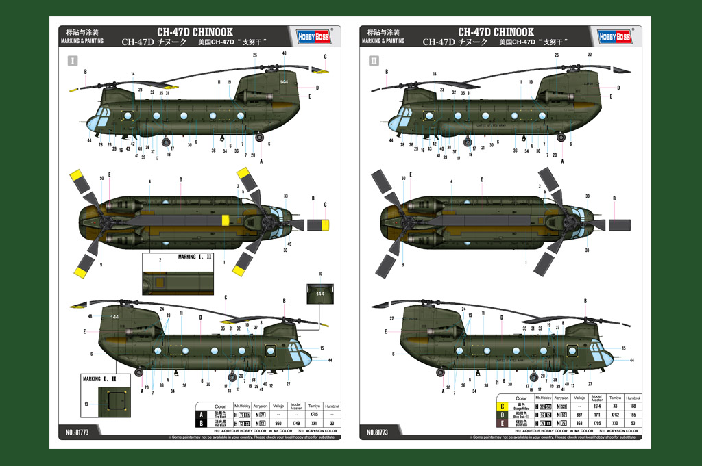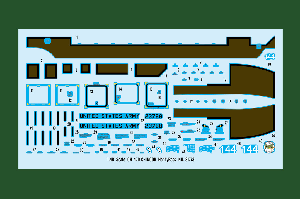 Боинг CH-47 «Чинук» (англ. Boeing CH-47 Chinook, CH - от Cargo Helicopter) — американский тяжёлый военно-транспортный вертолёт продольной схемы. Разработан на основе CH-46 и широко эксплуатируется с начала 1960-х годов. Сменил в Армии США вертолёт H-37, позже — и CH-54. Состоит на вооружении более 20 стран мира. Кроме США, производился с 1970 г. в Италии (более 200 вертолётов) и Японии (фирмой «Кавасаки» произведено 54 вертолёта). CH-47D: модификация с целью увеличения ресурса, грузоподъёмности и иных характеристик. С 1993 года начата программа продления срока эксплуатации имеющихся CH-47D дополнительно на шесть лет Длина: 531,8 мм Диаметр ротора: 376 мм Всего Пластиковых Деталей 330+ Всего 8 литников и фюзеляж Детали с фототравлением 1 рамка