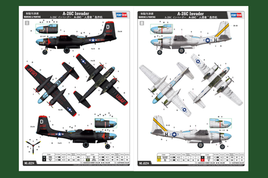 Дуглас A-26 «Инвэйдер» (англ. Douglas A-26 Invader) — американский ближний бомбардировщик, штурмовик. Совершил первый полёт 10 июля 1942 года. Всего построено около 2500 машин. В 1948—1966 годах носил обозначение B-26, что иногда приводит к путанице с таким же по обозначению и близким по назначению бомбардировщиком B-26 «Мародёр», снятом к тому времени с вооружения. Длина: 485 мм Размах крыльев: 667 мм Всего Пластиковых Деталей 270+ Всего литников 14 литников и шины Детали с фототравлением 1 рамка