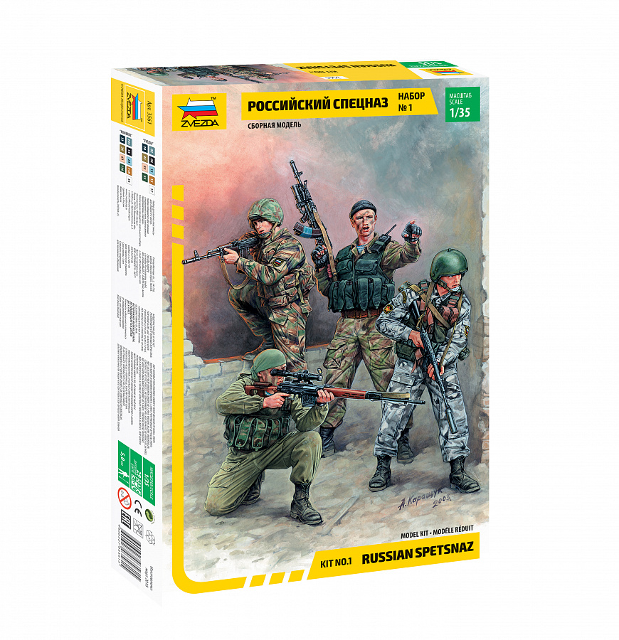 Сборные солдатики - Российский спецназ (набор № 1). Набор состоит из 4 фигур бойцов подразделения специального назначения Российской Федерации. Группа вооружена автоматами Калашникова различных модификаций и снайперской винтовкой системы Драгунова. Набор деталей из пластмассы для сборки 4-х фигур.