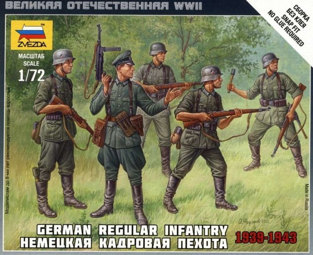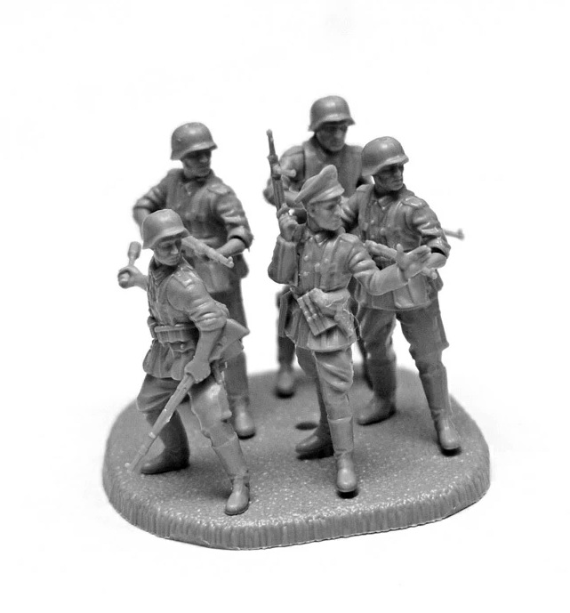 Сборные солдатики - Немецкая кадровая пехота 1939-1943. Историческая справка: Ветераны военных кампаний на Западе, к июню 1941 года были самыми опытными и самыми лучшими солдатами того времени. Отличное оснащение армии позволило превратить опыт в результат. На первом этапе Войны немецкая пехота – была лучшая в мире. Состав набора: 5 неокрашенных фигур 1 отрядная подставка с флагом инструкция по сборке