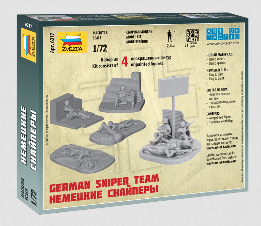 Сборные солдатики - Немецкие снайперы. Историческая справка: Как известно, германская армия первой стала активно применять точный винтовочный огонь специально обученных еще в мирное время снайперов для уничтожения наиболее важных целей – офицеров, связных, дежурных пулеметчиков, артиллерийской прислуги. Уже в конце войны немецкая пехота имела в своем распоряжении до шести снайперских винтовок на роту. Стоило только солдату или офицеру неосторожно высунуться из-за бруствера окопа, как мгновенно со стороны немецких траншей щелкал выстрел снайпера. Моральный эффект от таких потерь был чрезвычайно велик. Именно немецкий опыт практического применения снайпинга в условиях установившихся долговременных позиций послужил толчком для появления и развития этого вида военного искусства в войсках союзников. Состав набора: 4 неокрашенные фигуры 1 отрядная подставка с флагом 1 инструкция по сборке Сборка осуществляется без использования клея.