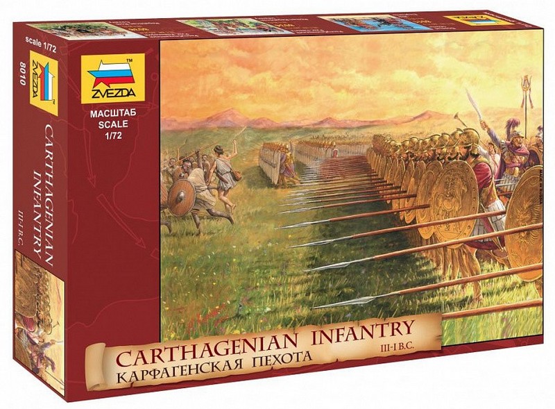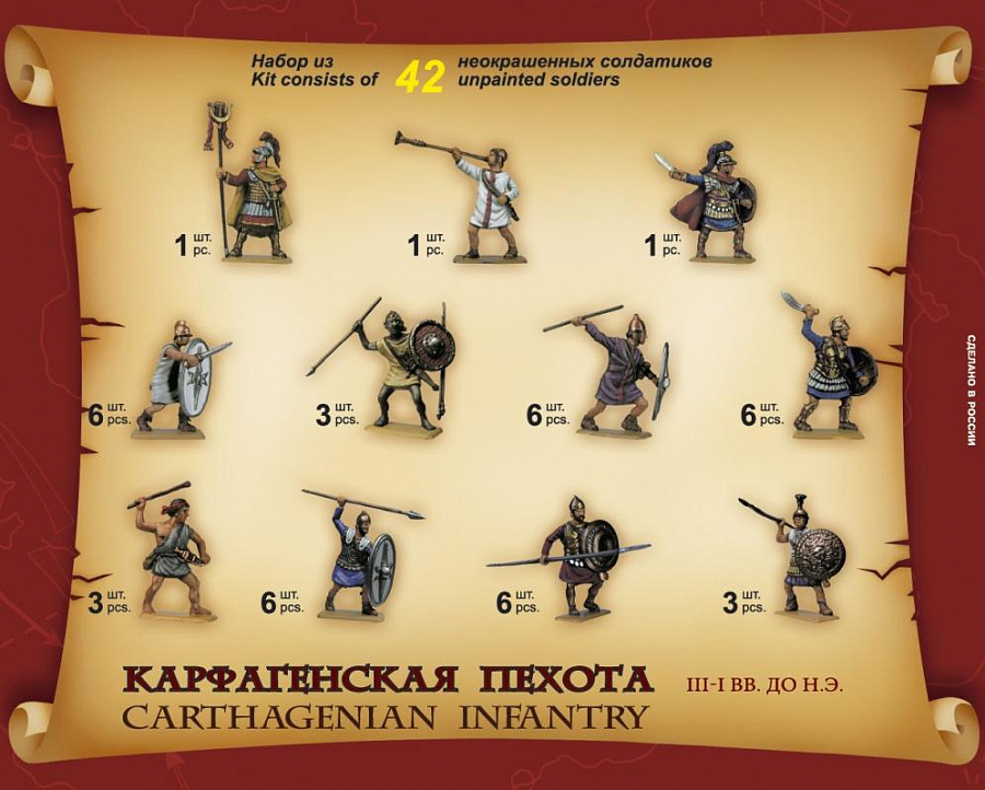Сборные солдатики - Карфагенская пехота. Историческая справка: Основой карфагенского войска была пехота, в которую входили ливо-фини- кийцы - народность, сформировавшаяся в результате колонизации ливийских земель финикийцами. Ливийско-финикийская пехота была вооружена по эллинистическому образцу. Тяжелая пехота носила мускульные кирасы и кольчуги, шлемы греческого эллинистического типа, часто с гребнем без конских волос и круглые греческие щиты. Вооружалась тяжелая пехота копьями и мечами. Воины легкой пехоты носили обыкновенные неподпоясанные тоги, овальные римские щиты и вооружены были метательными копьями и мечами. На острове Крит карфагенская армия набирала хороших пращников, которые поражали противника на расстоянии 120-160 шагов.