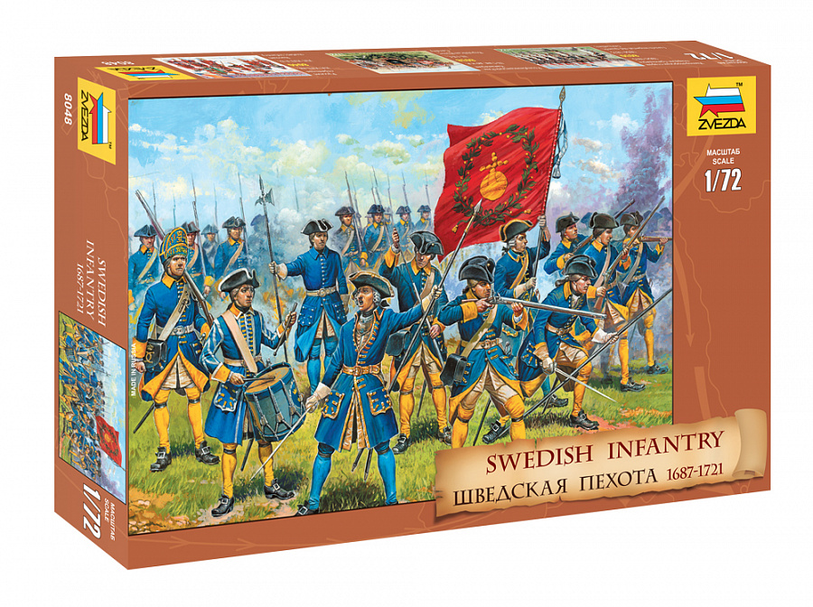Набор шведской пехоты времен Северной Войны (1700-1721). Пехотинцы Карла XII одержали ни мало блистательных побед, и прославились на весь мир своей стойкость и храбростью. Например, при штурме артиллерийских батарей, всегда связанном с крупными потерями, солдаты не пытались укрыться от картечи и ядер - им предписывалось идти в атаку в полный рост, с высоко поднятой головой. Солдаты вооружены мушкетами и шпагами. В наборе 43 фигурки солдатов.