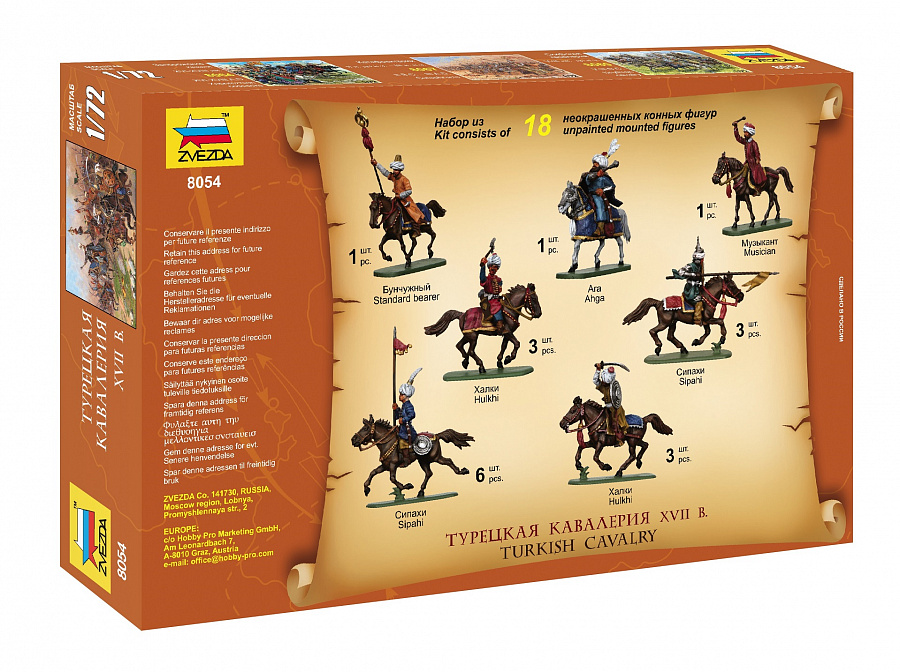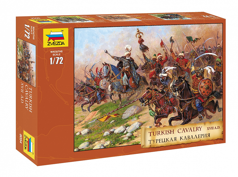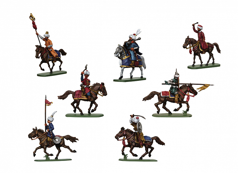 Ядром турецкой конницы, начиная с XV века, были сипахи – феодальные ополченцы империи. Изначально количество сипахи доходило до 40 тысяч всадников, но со временем их число сокращалось. К началу XVII века возрастает военное значение - личной гвардии султана, состоявшей из военнопленных и рабов. Войска пограничных земель представляли собой отряды легкой конницы – акинси. Длина 24 мм Деталей 18 шт.