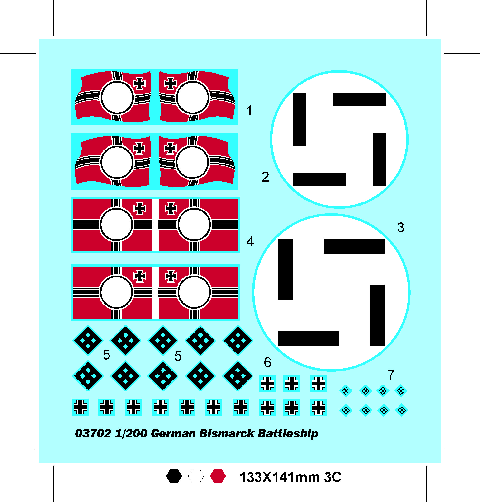 «Бисмарк» — линкор немецкого военного флота, один из самых известных кораблей Второй мировой войны. Назван в честь первого канцлера Германской империи Отто фон Бисмарка. Во время своего первого (и единственного) похода в мае 1941 года потопил в Датском проливе британский линейный крейсер «Худ» (англ. HMS Hood). Начавшаяся после этого охота британского флота за «Бисмарком» спустя трое суток закончилась его потоплением. Длина: 1265 мм Ширина: 181 мм Всего Деталей 1700+ Металлические детали - якорная цепь, вал, Детали с фототравлением 13 рамок Всего литников 45 литников, корпус, палубы и надстройка - 4 литника для 4 самолетов Ar196 w.