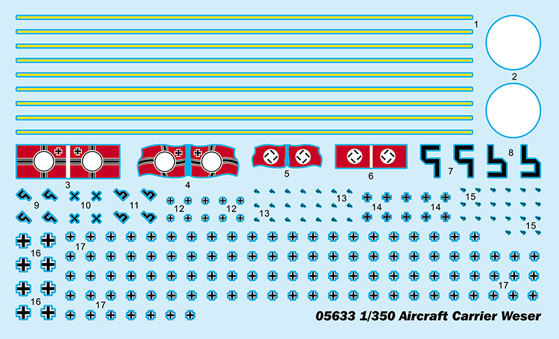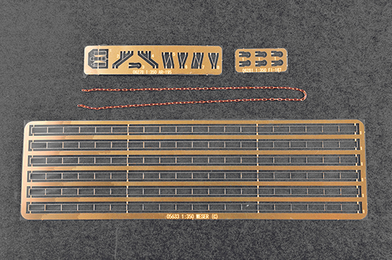Weser (или Seydlitz) — немецкий недостроенный авианосец времён Второй мировой войны. Киль под судно заложили в декабре 1936 года, а корпус спустили на воду в январе 1939 года. Однако на вооружение Кригсмарине корабль так и не поступил. Судно должно было иметь водоизмещение около 17 000 тонн, максимальную скорость около 32 узлов. Палубное вооружение должно было состоять, вероятно, из: 10 105-мм пушек, 10 37-мм пушек и 24 20-мм пушек. В состав авиагруппы предполагалось включить 10 истребителей Ме-109 и 10 бомбардировщиков Ю-87 в вариантах, приспособленных для действий с авианосцев. Первоначально Weser был построен и был завершен на 95% как тяжелый линкор класса Admiral Hipper Seydlitz. Однако вскоре после начала Великой Отечественной войны работы над почти готовым проектом были остановлены. Работы были прерваны до 1942 года, когда было принято решение переоборудовать «Зейдлиц» в авианосец, и работы были переданы на верфь в сегодняшнем Крулевце. Однако из-за явного приоритета производства подводных лодок и нарастающих проблем с поставками различного сырья и комплектующих установка не была достроена до конца войны. «Везер» был потоплен в апреле 1945 года у ворот порта Крулевец. Однако уже в 1946 году он был вырыт со дна советскими войсками, но после того, как ремонт был признан нерентабельным, корабль был сдан на слом. Краткое описание модели Длина: 629,8 мм Ширина: 106 мм Всего частей 560+ Металлические части якорная цепь Рамки фототравления: 11 шт Всего литников: 29 шт, корпус и палубы