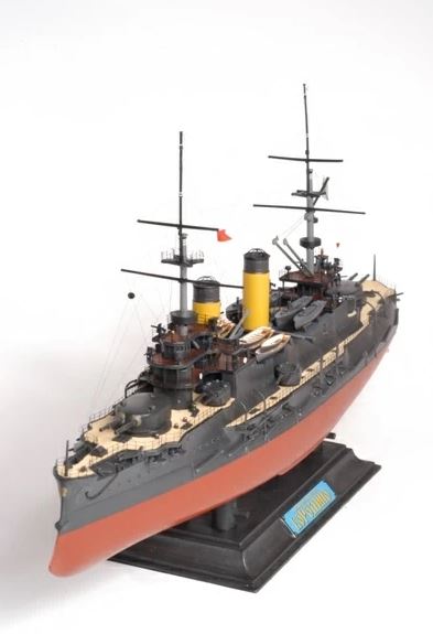 Сборная модель - Российский броненосец "Бородино". Историческая справка: Эскадренный броненосец «Бородино» — головной в серии из пяти эскадренных броненосцев, которые должны были составить ядро флота Тихого океана. В Цусимском сражении броненосец «Бородино», сменив поврежденного «Александра III», вел эскадру практически до конца дневного боя. Его командир маневрировал, пытаясь прикрыть поврежденный флагманский корабль и выполнить приказ адмирала — вести эскадру на прорыв во Владивосток. Тяжело поврежденный «Бородино» вел бой до последней возможности. Вскоре 305-мм японский снаряд, попавший в район носовой башни «Бородино», вызвал взрыв боезапаса. Броненосец, не выходя из строя, перевернулся и вскоре исчез под водой. Из 866 человек команды спасся единственный матрос. Набор деталей из пластмассы для сборки одной модели корабля. Краски продаются отдельно от набора. Состав набора: отливки инструкция по сборке