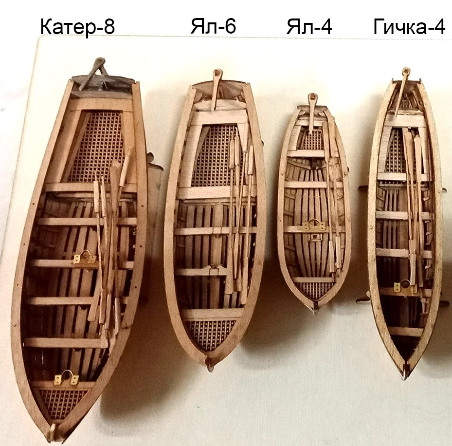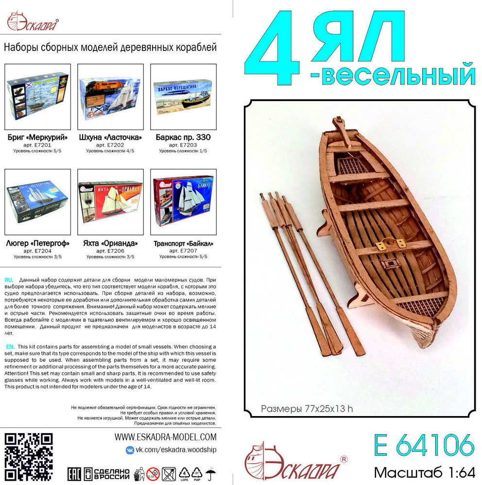 Ял 4-весельный. Материалы: шпон анегри, фототравление, фанера, переклейка, выкройки паруса на ткани, заготовки рангоута. Размеры в сборе мм - 88*25*13